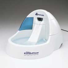 Pets love fresh flowing water. Make sure your furry friends always have plenty to drink with the Petmate Fresh Flow Pet Fountain. Perfect for multiple-pet homes, the Fresh Flow is an ultra-quiet purifying fountain that keeps your pets’ drinking water constantly moving. It uses a charcoal filter and a silent-running submersible pump system to provide naturally cool and oxygenated water. Includes a translucent 108-ounce reservoir that automatically adds water to the drinking bowl as needed and a 120-day supply of filters that remove odors and germs. An angled ramp prevents water from splashing out of the bowl and onto your floor. Non-skid rubber feet keep the fountain from sliding. Recommended by veterinarians. Use mild dish soap to clean by hand. Easy to assemble
