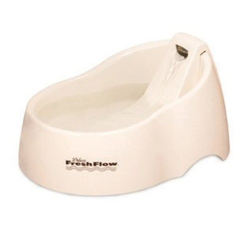 | 18 of 20 people found the following review helpful By SAMISOSA "juti1022" (New York) - See all my reviews Amazon Verified Purchase This review is from: Petmate Fresh Flow Pet Fountain, Medium, Bleached Linen (Misc.) This is the third Petmate Deluxe Fresh Flow Pet Fountain I have used for 3 cats. This product is not as sturdy as previous models, and cats can pull it a few inches into center of room when drinking. It is easier to clean than previous models, but feel it may not last as long. I clean the whole thing at least weekly, sometimes bi-weekly and add water every other day. The first thing to go is the pump with the last two. I clean the hair and grit out of the pump weekly, taking the whole pump apart. The pumps 'died' after about 1 and 1/2 years with previous models; the cord had exposed wires on the back of the pump when they quit working. Overall, the cats definitely drink more water with the fountain, so I keep replacing when the pumps quit working. The pump is expensive to replace and a whole new fountain is close in price to a replacement pump. 7 of 7 people found the following review helpful Amazon Verified Purchase This review is from: Petmate Fresh Flow Pet Fountain, Medium, Bleached Linen (Misc.) My cats love this product; they drink more water now with it.Product makes a little of noise, like any water bomb. Same noise as the aquarium, not big deal. The most important for me is that my cats loved it and they are happier and healthier so that make this product great for me. 5 of 5 people found the following review helpful By This review is from: Petmate Fresh Flow Pet Fountain, Medium, Bleached Linen (Misc.) My cat would rather drink from the decorative coffee table fountain than from this pet-specific circulating water bowl. This filtered bowl circulates constantly without making that distracting trickle noise, wide enough for her to stick her face in and slurp however she'd like, yet she still prefers the fountain that pumps enough water for her to feel the flow on her tongue. Believe me, I've tried to change her mind.This dish assembles fairly easily, though be thorough reading the instructions, which are vague. The charcoal filter doubles up, so the water comes down the spout very, very clean, which I appreciate, since my city puts chemicals in the tap water. And since the pump deposits the water on a slide rather than letting it fly, the water circulates silently, and you can run it overnight without that frustrating racket. But my kitty likes cold running water from the tap, and this small pump has too gentle a flow for her discriminating tastes. Perhaps... Read more |